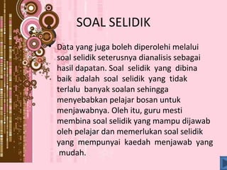Soal selidik ini digunakan untuk menilai pendapat serta pandangan pelajar mengenai pengajaran dan pembelajaran. Data-data yang diperolehi itu dikumpulkan untuk dianalisis. Keputusan ujian-ujian statistik seterusnya akan memberi kesimpulan terhadap ciri-ciri populasi yang dikaji.