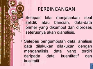 Kaedah ini akan dimanfaatkan untuk menyiapkan bab kelima yang melibatkan analisis data-data terkumpul secara praktikal. Reka Bentuk Tinjauan Matlamat Deskriptif Penjelasan Penerokaan Jenis Kajian Fokus Skop Tempoh Masa Pungutan 10. Pelaksanaan soal selidik memerlukan masa dan pemikiran yang mendalam agar soal selidik mendapat sambutan yang memberangsangkan.